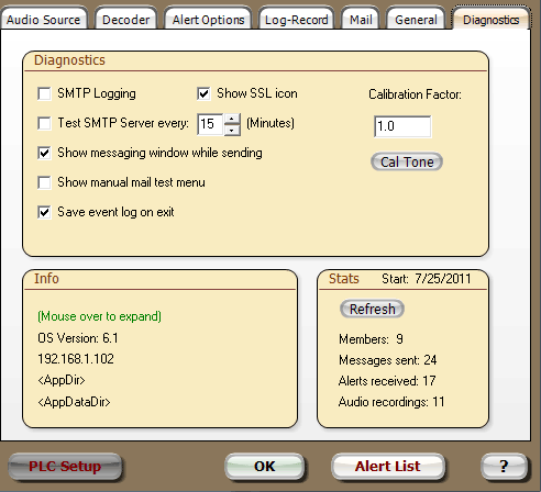 First is the Windows OS Version. Below, is the computer's local IP address. Mouse over <AppDir> or <AppDataDir> to reveal file locations for the application and data folders. Tone-out and Email Lists are contained in the AppDataDir and program log files are stored in the AppDir. The alert log and audio recordings are saved in the folder shown on the Alert Options tab. For more about files see Appendix C.